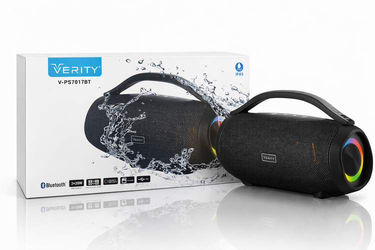 اسپیکر وریتی V-PS7017BT یک پارتیباکس پرتابل و تمامعیار است که با خروجی ۴۰ وات (دو درایور ۲۰ واتی)، حجم صدای فوقالعادهای را برای فضاهای باز و مهمانیها فراهم میکند. بدنه این اسپیکر با طراحی استوانهای و مجهز به یک دسته ارگونومیک، حمل آن را بسیار آسان کرده است. نقطه قوت این مدل، استاندارد IPX5 است که خیال شما را از بابت استفاده در کنار استخر یا زیر باران راحت میکند. نورپردازی RGB هماهنگ با موسیقی در دو طرف بدنه، جلوه بصری زیبایی در شب ایجاد کرده و با استفاده از قابلیت TWS، میتوانید صدایی فراتر از انتظار را با جفت کردن دو دستگاه تجربه کنید. این اسپیکر یکی از کاملترین گزینهها از لحاظ ورودیها بوده و تقریباً از هر منبع پخشی پشتیبانی میکند.